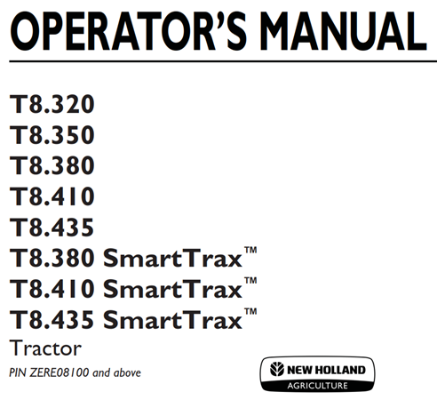 New Holland T8.320, T8.350, T8.380, T8.410, T8.435, T8.380 SmartTrax, T8.410 SmartTrax, T8.435 SmartTrax Tractor Operator’s Manual (PIN ZERE08100 and above)