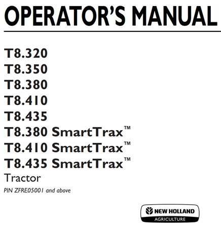 New Holland T8.320, T8.350, T8.380, T8.410, T8.435, T8.380 SmartTrax, T8.410 SmartTrax, T8.435 SmartTrax Tractor Operator’s Manual (PIN ZFRE05001 and above)