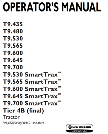 New Holland T9.435, T9.480, T9.530, T9.565, T9.600, T9.645, T9.700, T9.530 SmartTrax, T9.565 SmartTrax, T9.600 SmartTrax, T9.645 SmartTrax, T9.700 SmartTrax Tier 4B (final) Tractor Operator’s Manual (PIN JEEZ00000JF406501 and above)