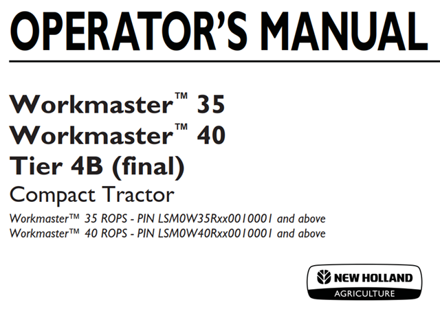 Original Factory Operator’s Manual for the New Holland Workmaster 35, Workmaster 40 Tier 4B (final) Compact Tractor.